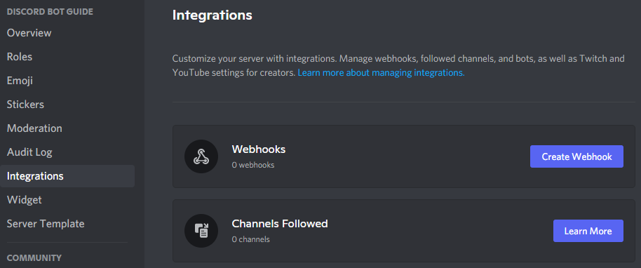 So to get started, Go to Server settings and you will see an Integration tab. From there you can create a webhook.